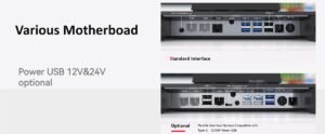 Terminalul POS oferă suport pentru mai multe modele de plăci de bază, permițând adaptarea configurației hardware în funcție de nevoile specifice ale afacerii. De asemenea, dispune de opțiuni de alimentare USB flexibile, cu tensiuni opționale de 12V și 24V, asigurând compatibilitate extinsă cu diverse periferice și accesorii POS, pentru o integrare simplă și eficientă.